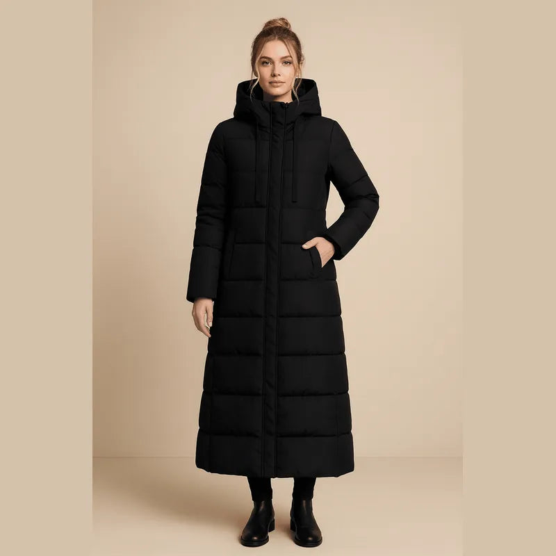 A sleek balance of warmth and refinement, this long quilted puffer is tailored for modern winter living. Its elongated silhouette with high collar and hood offer both protection and poise, while lightweight insulation ensures lasting comfort through every chill. Designed to transition effortlessly from city streets to evening outings with understated elegance.